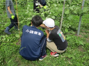 「ワイン文化を未来へ繋ぐ会」の方にお声かけいただき、小諸商業高校の生徒の皆さんと一緒に、ワインの原料のぶどうの手入れ作業をさせていただきました。高校生のお兄さんお姉さんはとても優しく、丁寧に作業の仕方を教えていただきました。