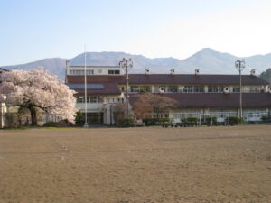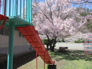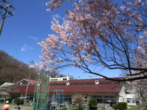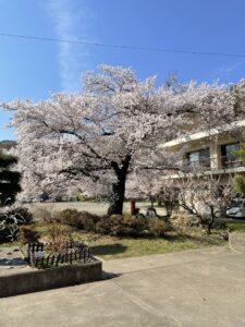 2025/4/9 千曲小学校と満開の桜。青空に映えてとてもきれいですね。